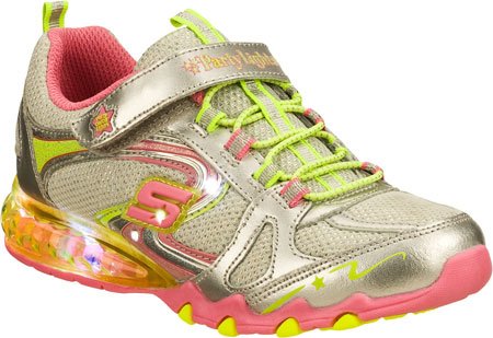 Get the party started with outrageous light up fun in the SKECHERS S Lights: Party Lights - Sparkle Diamonds shoe. Smooth leather and mesh fabric upper in a slip on sporty casual sneaker with colorful light up effect and on-off switch. Padded collar and tongue. Soft fabric shoe lining. Cushioned insole. Shock absorbing midsole. Visible heel air cushion design. Flexible rubber traction outsole. Colorful blinking lights on side and inside midsole heel last a full 8 seconds! Light sequence blinks in several colors and speeds. Lights can be turned off with easy-operating switch.