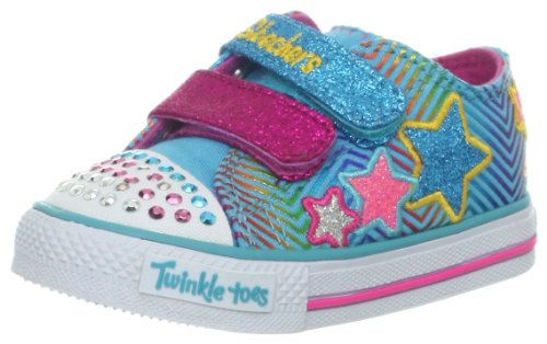 • It'll be triple the fun with this colorful light-up sneaker • Metallic fabric upper with light-up details that blink with each step • Three hook and loop closures • Twinkle Toes multicolored sequins on toe cap • Cushioned comfort footbed • Vulcanized rubber midsole with textured toe bumper • Flexible rubber outsole
